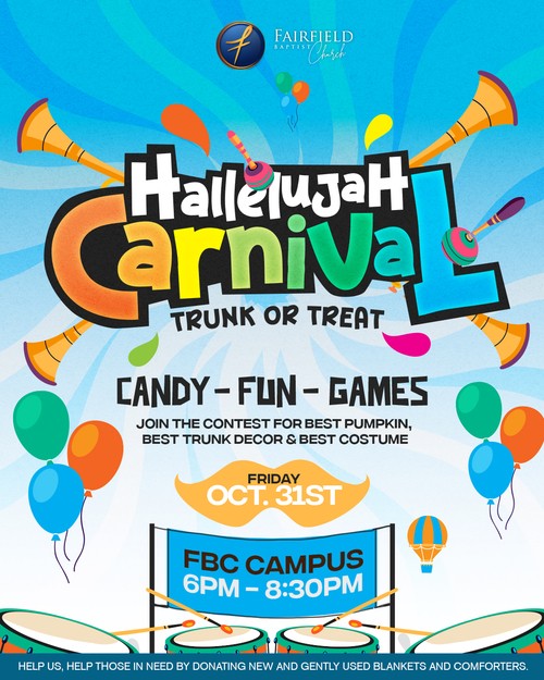 Join us for Fairfield Baptist Church’s annual Hallelujah Carnival: Trunk or Treat! This family-friendly celebration brings together our church and community for a safe, fun, and faith-filled evening. With decorated trunks, games, contests, food, and music, there’s something for everyone. Bring your family, invite your friends, and come ready for an evening of joy!